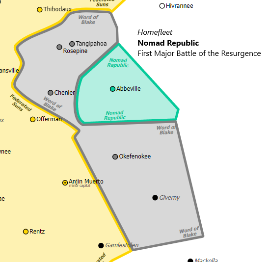 Nomad Republic was at their last stop before their exodus into the Periphery to start anew on a series of worlds discovered by expedition teams sent out by Devlin Stone, in the event they were defeated on Terra. Abbeville was working alongside the present Command staff of Nomad Republic so they would be able to communicate with the Inner Sphere. It was an economic boom for the world while the fleet was there. However, the good times quickly ended with the appearance of a fleet in system.